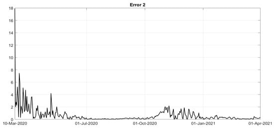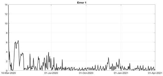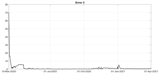 The other parameters of the model can be identified by minimising the cost index (34) or a simplified version, if (35) is assumed, thus yielding the evolutions of , , , , and indirectly, of . The corresponding non-controlled constant values a, , , c and can be deduced, if needed, from the first values of the quantities with the bar sign, recalling that the controls , are assumed between 0 and 1. By using the @Matlab software and the function fmincon, the fitting between real data and the model output was performed. The minimisation of the cost index during the period February–December 2020 was obtained, after a trial and error procedure, with the following choice of the weights: , , , with , being the vaccination campaign not started at that time; from January 2021, the weights are chosen as equal to , , , . In Figure 1, Figure 2 and Figure 3, the evolutions of the diagnosed infected patients, of the recovered individuals and of the dead subjects are shown along with the corresponding real data; a good fit can be appreciated, in some way overcoming the not completely satisfactory data collection of the first period of the pandemic; in particular, in Figure 1, the three waves of pandemic can be noted, in April 2020, in November 2020 and March 2021. In Figure 4, Figure 5, Figure 6, Figure 7 and Figure 8, the identified control actions are shown; in each figures the dotted vertical lines correspond to the significant changes in the adoption of the containment measures previously recalled. Particularly interesting is the evolution of in Figure 4: a general decrease in the evolution of can be noted until July, due to the effects of the strict lockdown of Phase 1; then, an increase can be noted until the middle of October, with the re-opening of schools and of many activities. New increasing containment measures were then applied with the “phase of colours” starting in November, thus obtaining a decrease in the values of until March. The evolutions of and are quite similar, as shown in Figure 5 and Figure 6, corresponding to an increase in the capability of isolating subjects for a quarantine period and the improvements in the swab testing, respectively, with two decreasing periods in June 2020 and December 2020. As far as the evolution is concerned as desirable, it has been increasing since the very beginning of the pandemic, showing a general resilience capability in the sanitary system, as shown in Figure 7. The vaccination action, represented by , only started in January 2021; its evolution, to date over less than three months, shows an oscillatory increase until the middle of February, and then an increasing trend, as shown in Figure 8. To evaluate the goodness of the identification step, the evolutions of the percentage of the normalised errors, in absolute values, indicated, respectively, with Error 1, Error 2 and Error 3, between the real numbers of diagnosed infected patients, of recovered individuals and of deaths and the corresponding quantities obtained from the model, are shown in Figure 9, Figure 10 and Figure 11. Note that, after the first few days of the identification period, the maximum error was always less than and in general, after July, less than . The identification of the evolutions , , , is important since it allows to determine a connection between the decisions about the containment measures and how they have been applied by the population; for example, the strict lockdown of Phase 1 was not applied by the population as an on–off control: it required some weeks to adapt to the new condition. Therefore, on the basis of this consideration, it is possible to study some scenarios determining what could have happened if different choices were made. Five scenarios are considered: