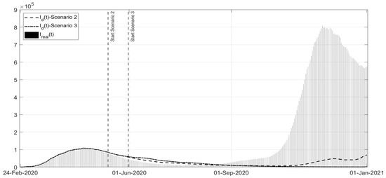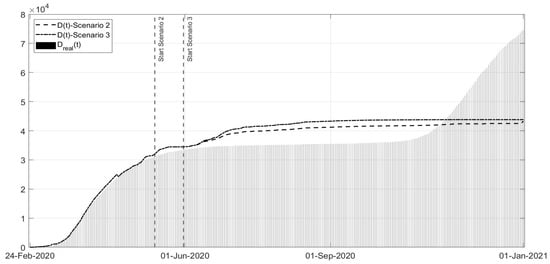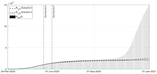 Scenarios 2 and 3: evolution of in the two scenarios versus the corresponding real data.