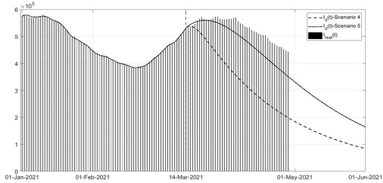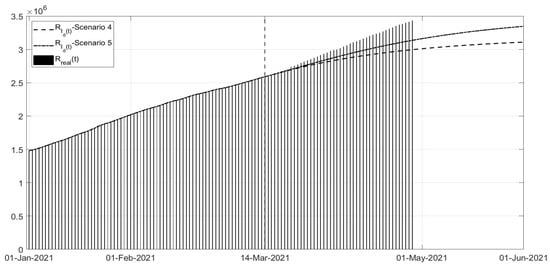 Scenarios 4 and 5: evolution of in the two scenarios versus the corresponding real data.