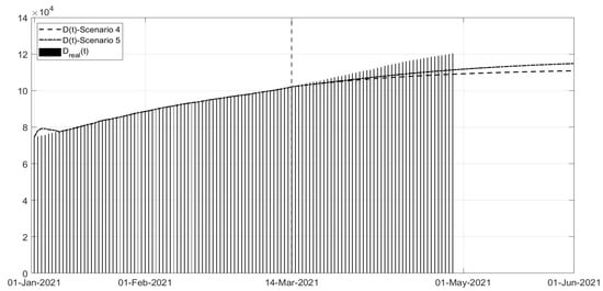 Scenarios 4 and 5 regard the management of the vaccination phase, Figure 18, Figure 19 and Figure 20; all governments are trying to accelerate the vaccination campaign, in the meantime limiting the spread of virus to avoid the development of new variants. In some cases, such as in the UK, the vaccination campaign was associated with a strict lockdown obtaining a rapid decrease in the number of infected patients and deaths. In Scenario 4, a fast decrease in the number of infected patients can be noted, whereas the application of the phase of colour containment measures, shown in Scenario 5, yields a less evident decrease in the infections, Figure 18. In particular, the simulation results in Figure 18, Figure 19 and Figure 20 were compared with the real data representing what is currently happening; it can be observed that the currently applied containment measures allowed a decrease in the number of new infections, slower than in the simulated scenarios, probably also for the new unknown variants of the virus. Nevertheless, it must be stressed that, as seen, any new action or behaviour influences the evolution of the spread, and in particular, the number of infected patients. The increased number of infected patients implies an increased number of deaths, as can be seen in Figure 20.