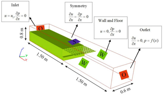 After applying the boundary conditions, the time required for the flow stability time was 35 s which is the steady-state in all models in the 20th second. The time step was 0.01 s. Table 2 shows the range of operating parameters, and Figure 2 shows the geometric characteristics of the vertical slope with boundary conditions in the presence of a step and a grid dissipator. It should be noted that the type of mesh used in this study is a cartesian.