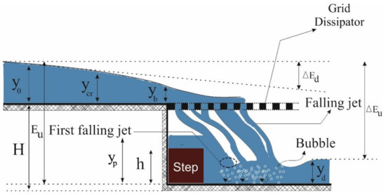 Sometimes, during the construction of water supply systems, the natural slope of the ground is steeper than the slope required for the design. In such a situation, a drop is usually used to transfer water from a high level to a lower level and thus cause energy loss due to the increase of flow depth and decreasing the flow velocity. In addition to slope control, the drop structure also reduces the earthworks volume. One of the most critical issues to address downstream of a hydraulic structure is the flow’s kinetic energy [1]. The control structures must dissipate kinetic energy. Turbulence and water–air mixing are effective ways to increase energy dissipation. The use of grid structures and steps downstream of the vertical drop is a newer technique for energy dissipation. Grid dissipators are located in the path of a supercritical flow; they deposit the flow onto the downstream steps. By this process, they dissipate the destructive flows [2,3].