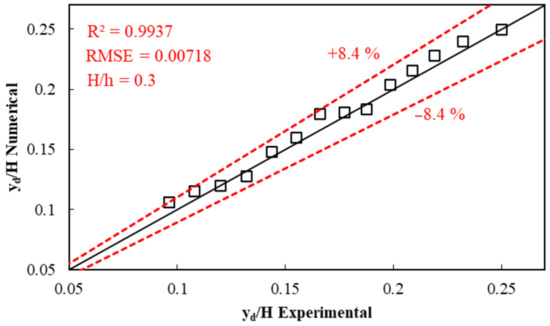 The mesh with 3,350,000 elements resulted in a root mean square error and a coefficient of determination of 0.781% and 0.993, respectively. This mesh was selected for performing further calculations. Figure 5 was prepared to relate the relative experimental and predicted depths downstream of the vertical drop. It is seen that the two results agree to within ±8.4%. Test 6 also has very good results, but because the number of evaluation parameters RMSE and R2 are very close to the values of test 5, to reduce the number of meshes, test specification 5 was used to continue the simulation.