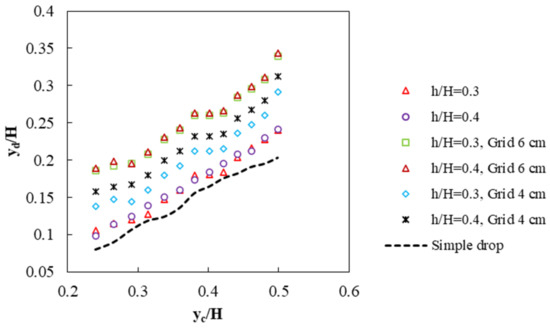 It is observed that with increasing relative critical depth, the downstream relative depth values increase in all scenarios. According to Figure 7, it is clear that for step heights, the value of the downstream relative depth increases with the use of grid dissipators. The jet flow downstream of the vertical drop passes through the pores in the grid dissipator. This process increases the water and air interference and increases oxygen in the water. This mixing also increases the downstream depth.