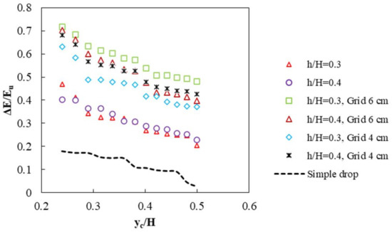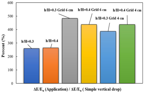 The data was extracted for two relative step heights and two grid-cell sizes. It is observed that for all models of a simple vertical drop, with increasing relative critical depth, the relative energy dissipation decreases. The minimum energy dissipation values occur with a simple vertical drop. In contrast, a maximum energy dissipation corresponds to a drop equipped with a vertical grid dissipator and a step with a relative step height of 0.3 and a grid size of 6 cm. The minimum energy reduction was 259%, whereas the maximum reduction is 483% (compared to the simple vertical drop case). Results are shown in Figure 9, where the significant effect on energy dissipation is evident. After flow passes over the vertical drop with a step, a portion of the flow passes through the dissipator holes. Following the dropping jets, some of the fluid flows towards the drop wall.