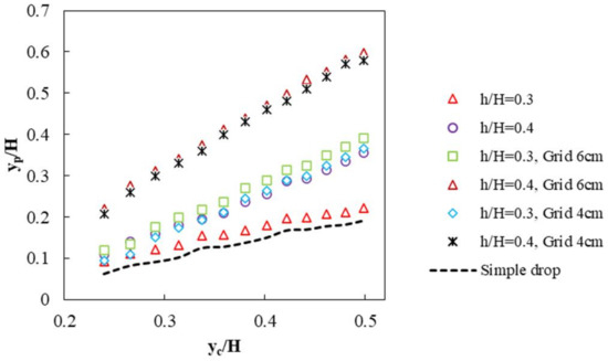 The relative pool depth values for the models studied in the present study versus the relative critical depth are shown in Figure 10. It is observed that in all models, increasing the relative critical depth increases the relative pool depth. The return flow discharge to the pool and the immersion created by the interference of the flow passing through the pores of the grid dissipators increases. This hydraulic phenomenon causes the relative critical depth and the relative pool depth as well. According to the figure, it can be seen that changing the size of the grid of grid dissipators does not affect the relative pool depth. However, compared to the model without grid dissipators, the relative pool depth in the vertical drop equipped with steps and dissipators has an increasing trend.