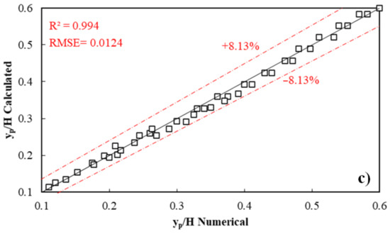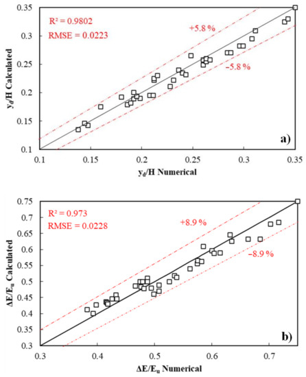 As can be deduced from the figure, for all cases, the relative downstream depth can be predicted with root mean square error and the coefficient of determination values of 0.023 and 0.980, respectively. The relative energy is predicted with root mean square error and coefficient of determination values equal to 0.0228 and 0.973. Similarly, the relative pool depth is predicted with root mean square error and coefficient of determination values equal to 0.0124 and 0.993, respectively. The predictions have maximum relative errors of ±5.8% and ±8.9%, and ±8.13%, respectively (as evident from the following images).