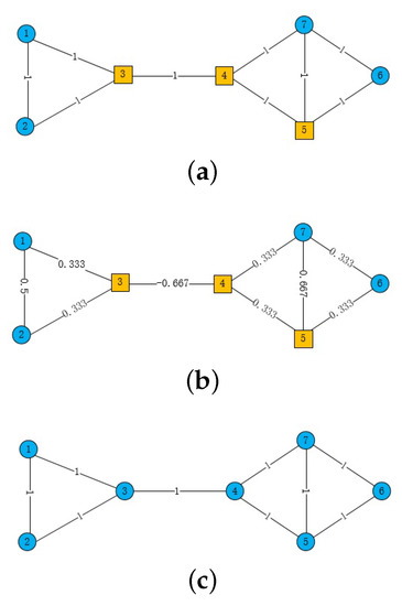 Take the network in Figure 1a as an example, where we only consider the network structure without considering node attributes. In general, random walks are carried out according to the weights of the edges. Note that the weights of the edges in this network are all 1. Assume that a random walk arrives at node 3 and then decides which node to go to next. According to the traditional decision method of random walk, it is equally possible to choose nodes 1, 2, and 4 in the next step. However, we observe that nodes 1, 2, 3 form one community, while nodes 4, 5, 6, 7 form another community. Considering the community structure, the possibility of selecting node 4 in the next step is less than the possibility of selecting node 1 or node 2 because node 4 and node 3 are not in the same community, while node 3 is in the same community as node 1 and node 2. In other words, if the random walk can reflect the community structure, that is, the meso structure of the network, it can more truly reflect the network structure. The network in Figure 1b corresponds to the network in Figure 1a, and the weights of its edges are the Ricci curvatures of the network’s edges in Figure 1a. As can be seen from Figure 1b, the Ricci curvature of edge (3,4) is −0.667, which is smaller than the Ricci curvature of edge (1,3) and edge (2,3). Therefore, if the random walks are carried out not simply according to the weights of the edges, but according to the Ricci curvatures of the edges, then in the previous problem, starting from node 3, the possibility of selecting node 4 in the next step is less than the possibility of selecting nodes 1 and 2. Consequently, the Ricci curvatures of edges can better reflect the network structure than the weights of edges. In the algorithm, considering that Ricci curvatures have negative values, they are not easy to deal with, so we use a sigmoid function to transform the Ricci curvatures.