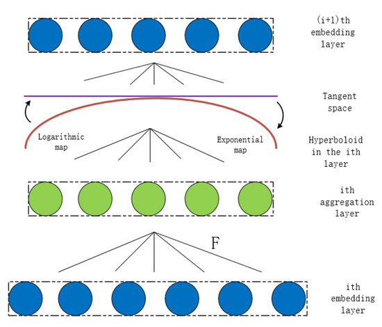 - Projections. The projection operation here is to project the vector onto the hyperboloid manifold and the corresponding tangent space, which is useful for the optimization process. Let ; then, it can be projected on the hyperboloid space in the following way: