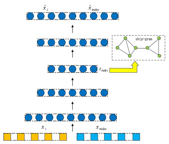 It is assumed that are node pairs sampled by a random walk based on the Ricci curvature. Node pairs in this set are considered to be similar, while other node pairs not in this set are considered to be dissimilar. Let be any node pair in set . As mentioned in the previous subsection, the attribute corresponding to node is input into the autoencoder to obtain the reconstructed representation . The representation of node in the most intermediate hidden layer of the autoencoder is denoted as , which is the representation obtained by integrating the structure and attribute information in the neighborhood of node . Since is a similar node pair, we adopt the processing method in ANRL to further integrate attribute information and structural information in the skip-gram module. We use the following conditional probability to express the similarity of node pairs :