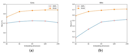 The encoder module and skip-gram module are adopted in the basic architecture of our RHAE model and ANRL. In order to better compare the two models, we changed the embedding dimensions to compare the node classification performance of the two models while keeping other parameters unchanged, that is, the same setting as in Section 4.3. The datasets used here include Cora and Wiki. All the results are shown in Figure 5.