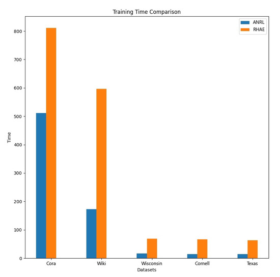 RHAE is inspired by ANRL. Now, let us compare the training time taken by the two models. We implement the algorithm RHAE using the TensorFlow framework. All experiments in this paper were conducted on a CPU, using a notebook computer with an Intel Core i7 2.8 GHz processor and 8 G RAM. Figure 6 shows the results of the training time comparison between the two models on each dataset. RHAE takes more training time than ANRL, mainly because RHAE has more operations, such as calculating the Ricci curvature.