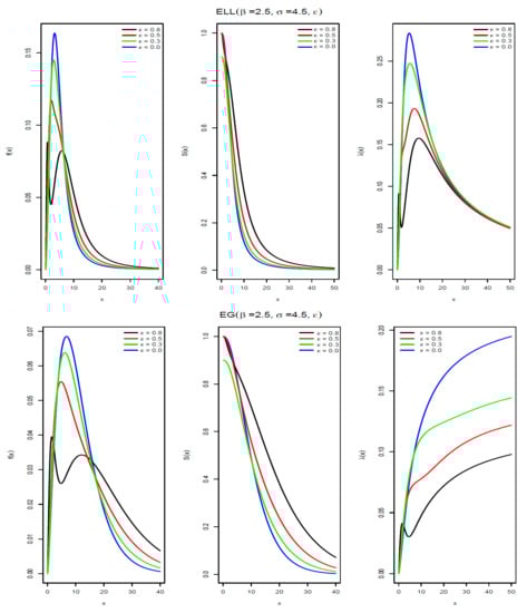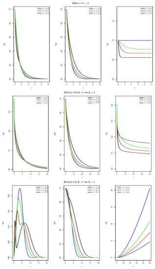 Interestingly, in contrast to the exponential distribution, it can be shown that the hazard function of the EE distribution is not constant, but decreasing in x. This feature can be easily observed in Figure 1 (top panel), where we show the pdf, survival and hazard functions of the EE distribution for different values of the parameter when . Please note that as . Additionally, as .