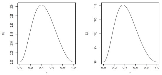Please note that for any value of , and . It can be seen that and . Figure 3 depicts the behavior of the skewness (CS) and kurtosis (CK) coefficients as a function of . In the figures we observe that the maximum skewness is attained ar , while the maximum kurtosis coefficient is obtained when .