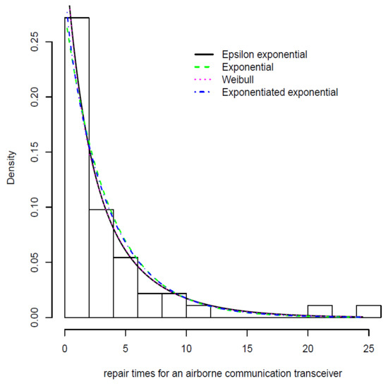 Looking at the AIC values, we obtain = 84,139.68 and = 85,267.62 for the epsilon–exponential and exponential model respectively, and therefore we conclude, the epsilon–exponential is a better model for these data, based on this criteria.