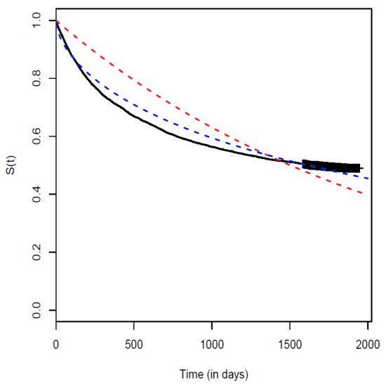 The best model is deemed to be the one with the smallest AIC. For the data set in the example, we obtain , , , and . It follows that in terms of the AIC criteria, the epsilon–exponential shows the best performance when fitting these data. Figure 4 shows the fit of the different models used in the example. Figure 5 displays the three estimated survival functions for this data set.