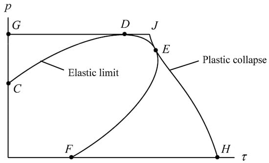 It is shown below that there are two plastic collapse mechanisms and two special solutions. The geometric interpretation of the general structure of the solution is shown in Figure 2 to simplify its further discussion. Curve CDEF represents Equation (14). It encompasses the region where the loading paths are purely elastic. Point C corresponds to the purely mechanical loading and point F to the purely thermal loading. The p-coordinate of the former is determined from (14) where one should put , and the -coordinate of the latter from the same equation where one should put .