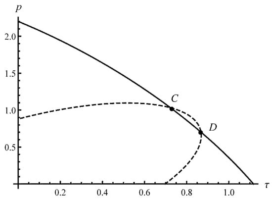 First, it is necessary to show that the assumption that plastic yielding initiates at the inner radius is satisfied. Figure 3a shows the dependencies of p on found from (14) and (15). The broken line corresponds to Equation (14) and the solid line to Equation (15). Point C belongs to both curves. The values of p and at this point satisfy (13). Any loading path in the space that does not contain point C, first intersects the broken line. Therefore, plastic yielding initiates at the inner radius of the disk. This feature of the solution is preserved for DC06, AA6016-T4, and AA5182-0 (Figure 3b). However, the solution behavior for AA3104-H19 is qualitatively different (Figure 4). This figure shows that the curves corresponding to Equations (14) and (15) intersect at two points. Point C belongs to the line determined by Equation (13). In this case, plastic yielding simultaneously initiates in the entire disk. The intersection at point D means that plastic yielding simultaneously initiates at the inner and outer radii. However, the interior of the disk is elastic at this instant. Plastic yielding initiates at the outer radius if the loading path in the space intersects the solid curve between points C and D. This feature of the solution contradicts the initial assumption. Therefore, AA3104-H19 is not considered below.