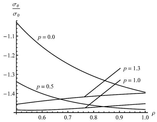 Figure 6 and Figure 7 depict the radial distribution of the radial and circumferential stresses, respectively, in a DC06 disk. The curves show the effect of the loading conditions of the stress distributions at collapse. It is worthy of note that the radial stress is a monotonically decreasing function of at any p. Moreover, the magnitude of this stress decreases as p decreases at any point of the disk. The qualitative behavior of the radial distribution of the circumferential stress depends on the value of p. If p is small enough, then the circumferential stress is a monotonically decreasing function of . At intermediate values of p, the function attains a local minimum at a point of the interval . If p is large enough, then the circumferential stress is a monotonically increasing function of .