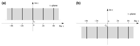 In Appendix A we show that a series expansion in terms of Legendre polynomials can be regarded as a trigonometrical series, i.e., as a series of the type (see Formulae (A3), (A4) and (A19)). Then, it is quite natural to introduce the complex plane of the variable , (), and consider in this plane the following domains (see also [12]). For we define: , and . Correspondingly, we introduce the cut-domains: , where (see Figure 1a) and , where (see Figure 1b). Moreover, we will use the notation to denote every subset A of which is invariant under the translation group .