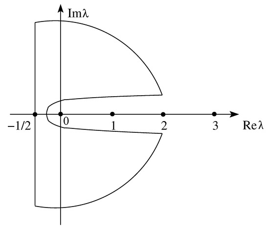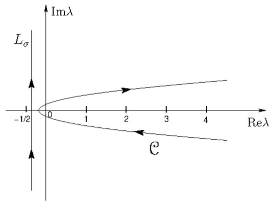 Let us now regard as the integration variable; the integration path in integral (A1), corresponding to , is the (oriented) linear segment starting at and ending at (see Figure A1). As shown by equalities (A8) and (A9), the integrand is an analytic function of in the disk (since ). Then, the integration path can be replaced by the circular path . Moreover, by using the fact that is positive for , and therefore at , we conclude from the left equality in (A6) that in the r.h.s. of Formula (A8) there holds the following specification (for ):