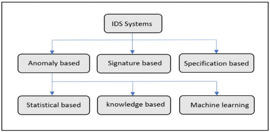 IDSs are categorized into three groups, i.e., anomaly-based detection, signature-based detection, and specification-based detection [23]. To summarize the taxonomy, we show a conceptual diagram in Figure 1.
