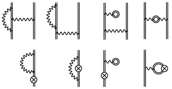 In what follows, we also rearrange the screened radiative corrections according to its usual representation by the many-electron diagrams in the ordinary vacuum formalism, displayed in Figure 3:
