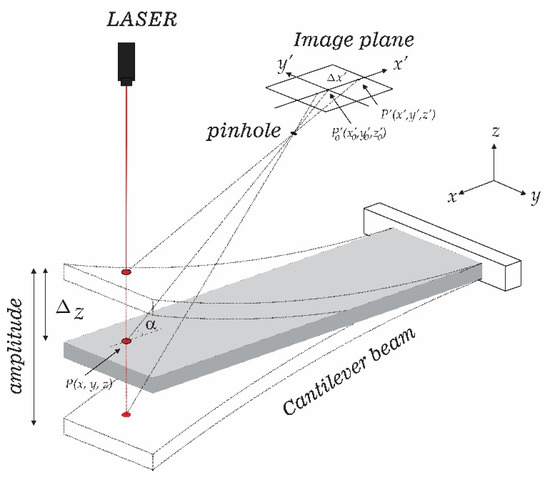The optical technique implemented in this work is based on laser triangulation techniques, which are commonly used in industry for inspection and quality control, have a simple structure, fast measurement, and easily interpreted results. The scheme in Figure 1 shows the experimental setup used to determine the mechanical displacement of a slim cantilever beam. This is based on the projection of a laser spot on the surface of the cantilever beam at a point Here a camera forms an angle to the beam plane and captures the image of the spot on the surface at the center of the image plane in when the beam is in a static configuration (reference system). If a disturbance is applied to the beam, it begins to vibrate in the direction of the axis of the reference system, and these mechanical displacements are observed in the Figure 1 as lateral displacements .