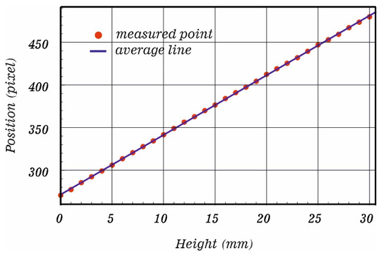 Experimentally, measuring the parameters involved in Equation (10) is not very practical, so the use of a calibration process of the optical measurement system is conveniently used, i.e., the motorized linear displacement stage travels known equidistant displacements along the z axis, and these displacements are observed in the image plane (Figure 1) of the camera as transverse displacements and are measured in pixels. For each displacement, the image of the projected laser spot is captured and the position of the centroid is computed; in this way, a calibration curve is constructed (Figure 2), which allows a conversion of pixel units to millimeters of the measurements made, as well as the sensitivity of the measuring instrument on the z axis; that is, the minimum amplitude of vibration that can be measured if we consider that the smallest measurable unit in the image plane is of the order of 1 pixel.