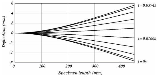 The results shown are from the parameters found in each equation fitted to the model of Equation (11); the frequency is obtained directly by obtaining the parameter , with , and the damping coefficient c with , where m is the mass of the beam. These parameters are the same when the equation that describes the vibration path in units of displacement is obtained, i.e., performing the double integration of the fitting equation. This expression allows us to determine the maximum displacements at any instant of time t to reconstruct the modal forms. The Root Mean Square (RMS) results obtained from parameters such as frequency and damping coefficient for the sections measured along the beam were 12.058 Hz and 0.0211 Ns/m, respectively. The maximum amplitude is obtained at the free end with a magnitude of 5.98 mm at a time t of t = 6.93 s, which is from the moment that the accelerometer interface begins taking readings.