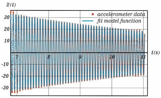 Using the accelerometer measurements, a set of data was selected in a time interval , taking as a reference the first maximum amplitude recorded by the equipment. Using the Least Square Complex Exponential method [47,48,49,50], this data is fitted to a nonlinear exponential, harmonic equation: