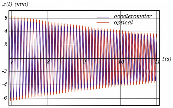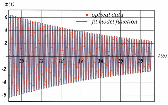 A total of 8691 data values were used for analysis, omitting information from unwanted initial readings. Subsequently, the data set was fitted to the model of Equation (11), obtaining the coefficients for the reconstruction of the vibration path and parameters required for the analysis of the dynamic response. Figure 5 shows the superposition of the experimental data from the accelerometer and the graph of the equation obtained with the fit made. It can be seen that the selected time signals contain one clear dominant decaying component. However, the time decay of the signal is not perfectly exponential, as it would be if only one mode would be present, which itself is due to higher order modes of the beam; however, in this work we will only analyze the first vibration mode of the system for validating the optical technique, while other modal forms can be found by measuring the transversal displacements of the system ( in the image plane).