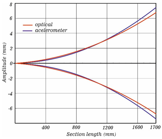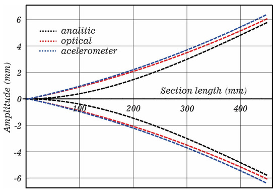 For the reconstruction of the first vibration mode, the maximum amplitudes are taken in each of the sections measured with both methods. Figure 7 represents the first vibration mode of the steel beam taken from the experimental results with both methods and fitted to a quadratic function, as well as the function obtained with the analytical method.