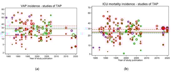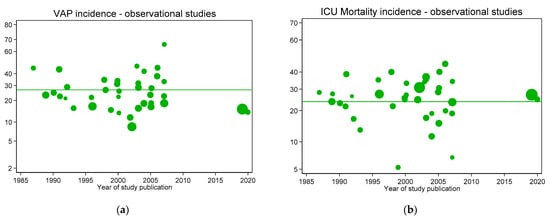 VAP (a) and ICU mortality (b) incidences per 100 patients as reported in groups from studies without intervention (observational studies; green symbols) versus year of publication. In each figure, the mean (green line) is shown as a benchmark. Note: Logit scale on y axis, data from [].