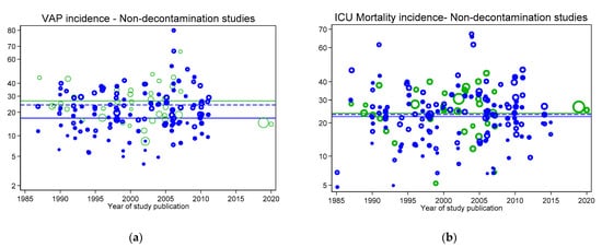 VAP (a) and ICU mortality (b) incidences for concurrent control (open blue symbols and mean; dashed blue line) and intervention (closed blue symbols and mean; solid blue line) from non-decontamination intervention studies versus year of publication. In each figure, the incidences per 100 patients as reported in groups from studies without intervention (observational studies; open green symbols) and the associated mean (green line from Figure 2) are shown as benchmarks. Not: Logit scale on y axis, data from [].