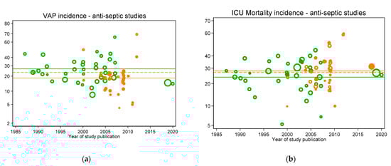 VAP (a) and ICU mortality (b) incidences for concurrent control (open orange symbols and mean; dashed orange line) and intervention (closed orange symbols and mean; solid orange line) from antiseptic intervention studies versus year of publication. In each figure, the incidences per 100 patients as reported in groups from studies without intervention (observational studies; open green symbols) and the associated mean (green line from Figure 2) are shown as benchmarks. Note: Logit scale on y axis, data from [].