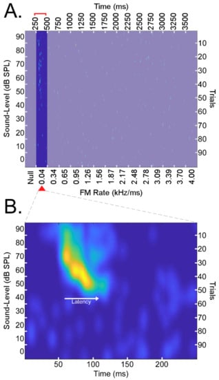 Each FM rate array was a series of 14 FM stimuli totaling 3750 ms in duration. Specifically, the FM rate arrays were composed of an initial 250 ms period without a stimulus (“null” stimulus period) in the echo-CF2 range followed by 14 linear FMs (presentation rate 4/s or one presentation every 250 ms) centered on the BFhigh of the neuron under study and increasing in modulation rate from 0.04–4.0 kHz/ms. Here, we extracted and analyzed only neural responses to the 250–500 ms section of each FM rate array. This 250–500 ms section corresponded to the presentation of FMs with modulation rates of 0.04 kHz/ms. Sound-level (i.e., amplitude) decreased by 10 dB SPL every 10 trials (100 trials total). All stimuli in the FM rate array were paired at the onset with a 30 ms CF at the BFlow of the neuron under study. An example of a DSCF neuron’s responses to the14 FM stimuli is provided in Figure 2A. Data corresponding to 0.04 kHz/ms (250–500 ms range) are highlighted to emphasize that this is the focus of the present study. Note that in the expanded view of this range in Figure 2B, the example neuron’s response latency increases as the sound level decreases, a typical “latency shift” common to most auditory neurons [87].