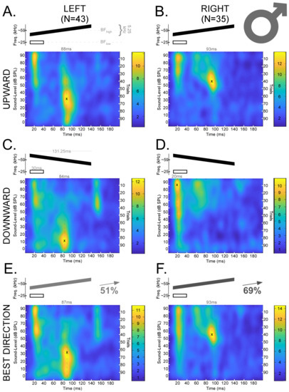 Previous research established that DSCF neurons are generally more responsive to upward than to downward FMs when the FMs were optimized for rate, bandwidth, central frequency, and BA [80]. In our sample, 101/176 (57%) DSCF neurons had greater responses to upward than to downward FMs when FM rates were all equal to 0.04 kHz/ms and the sound level changed by 10 dB SPL every 10 out of 100 trials. In males, maximal responses to FMs with rates of 0.04 kHz/ms were found in the upward direction in 51% (22/43) of left-hemispheric and 69% (24/35) of right-hemispheric neurons. In females, maximal responses to FMs with these same rates were found in the upward direction in 42.5% (17/40) of left-hemispheric and 66% (38/58) of right-hemispheric neurons. As stated above, previous research employed more optimal measures to assess the general directional preference of DSCF neurons and thus provides a better guide to this filter property. Nonetheless, these results show that a general upward FM directional preference in DSCF neurons is present even when assessed using FM stimuli not optimized for rate, BA, and other FM parameters.