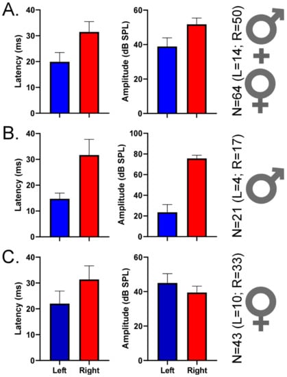 Mean peak response latencies and best amplitudes (BAs) of DSCF neurons selective for 0.04 kHz/ms. (A) Mean (± standard error of the mean) latencies (left column) and BAs (right column) of DSCF neuronal responses recorded from 64 neurons in male and female bats and elicited by 200 repetitions of their “best FMs” (optimized for BA, FM rate, FM bandwidth, FM central frequency, and FM direction). Recordings were from left (blue, N = 14) and right (red, N = 50). In this 64-neuron sample, 57.14% (8/14) of best FM directions for the left DSCF neurons and 64% (32/50) of best FM directions for the right DSCF neurons were upward. (B) Same depiction as “A” for responses recorded from 21 DSCF neurons (left, N = 4; right, N = 17) in male bats. In this 21-neuron sample, 50% (2/4) of best FM directions for the left DSCF neurons and 82.35% (14/17) of best FM directions for the right DSCF neurons were upward. (C) Same depiction as “A” for responses recorded from 43 DSCF neurons (left, N = 10; right, N = 33) in female bats. In this 43-neuron sample, 60% (6/10) of best FM directions for the left DSCF neurons and 54.54% (18/33) of best FM directions for the right DSCF neurons were upward. The lower number of left DSCF neurons across this sample reflects an earlier finding that, when presented with FM rates ranging from 0.04 to 4.0 kHz/ms, right DSCF neurons (especially in males) are far more likely to respond maximally to 0.04 kHz/ms than those on the left [67].