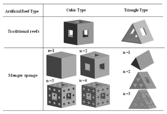 Three-dimensional (3D) Menger-type cube and triangle artificial reef (AR) models.