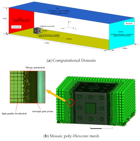 In the present study, the cube and triangle AR models are 1:50 scale models of the prototype models of the cube reef, and the triangle reef, respectively. Therefore, the model scale of the cube reef is (length width height), and the model scale of the triangle reef is 0.06 m 0.08 m 0.054 m (length width height). A computational domain of 2.26 m 0.48 m 0.3 m (length width height) was set in the Cartesian coordinate system, see Figure 3a. The AR model was placed in the middle of the computational domain. The width of the flow field around the AR model should be greater than 2.5 times the length of the AR model, to avoid the flow field being influenced by the sidewall effect [28]. The coordinate origin was set at the bottom centre of the reef 0.23 m upstream from the inlet and 2.03 m downstream from the outlet. The current speed around the Bohai Stain between Shandong Province and Liaoning Province of China is about m/s. According to the Froude number, in the current study, the velocity in the simulation, 0.085 m/s, is also scaled by geometric scale, = 50. The boundary conditions were divided into inlet, outflow, and wall as follows:
