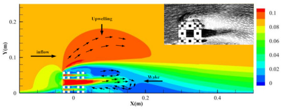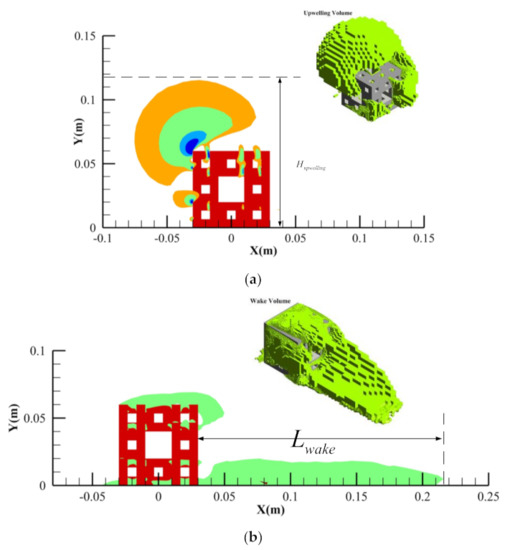 In this section, the impact of flow velocity on the upwelling and wake region of the fractal cube AR model (n = 3) was investigated. The upwelling height and wake length in the central planes, the upwelling volume and wake volume inside and around AR models were calculated according to the definition in Section 2.3.4. Table 8 shows no significant differences between the upwelling regions or wake regions inside or outside the cube AR model at various flow velocities.