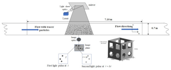 To verify the accuracy of the numerical model, the particle image velocimetry (PIV) experiments of a symmetrical cube porous reef model were carried out in the flume tank at the Tokyo University of Marine Science and Technology. The tank measures 7 m 0.3 m 0.7 m (length width height), see Figure 7. The test reef model was placed in the middle of the test area. A large number of tracer particles (hollow glass beads with a diameter less than 10 μm and density close to that of water) tracked the flow movement. A green laser beam through a composite beam expander lens piece was used to illuminate the flow field, which was subsequently captured by a charge-coupled device (CCD) camera. The images captured by the CCD camera were analyzed with the PIVlab software to obtain the velocity distribution, vector, and streamlines, which were visualized by using Tecplot360 software.
