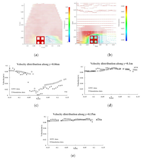 Comparison of the flow and velocity distribution line between the PIV model and numerical model. (a,b) are the velocity vector of the PIV model and numerical model, respectively; (c) is the velocity curve along y = 0.06 m; (d) is the velocity curve along y = 0.1 m; (e) is the velocity curve along y = 0.15 m.