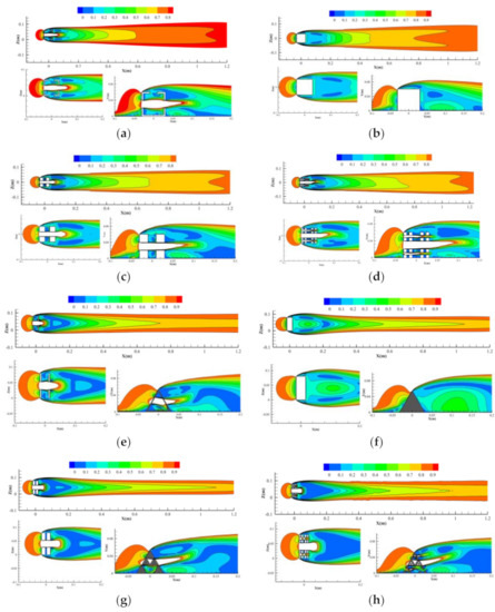 In this study, CFD numerical methods are effectively applied to describe the flow vortex and flow velocity distribution inside and outside the fractal AR models. With regard to the quantitative analysis of the influencing range of reef models, the flow field of the central cross-section plane (i.e., XOY central plane or XOZ central plane ) is more varied and complex [22]. Thus, the investigation of the AR flow field in the central plane facilitates comparisons of the flow performances by varying the fractal levels. Figure 4 presents the magnitude velocity contours in the central plane ().