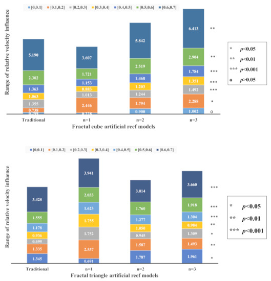 Figure 9e–h present the non-dimensionalized velocity distribution of the flow field around triangle AR models under different fractal orders (n = 1, 2, 3). Table 5 lists the value of the non-dimensionalized area coefficient with a certain velocity contour line of relative velocity behind the triangle reef models. A comparison of the flow field simulation results among these four triangle reef models showed that, regardless of the non-dimensionalized velocity influence range or non-dimensionalized area, triangle AR models with high spatial complexity have better flow field effects and more complex recirculating flows inside their bodies, similar to fractal cube AR models. However, for the downstream side, the influence range of cube AR models per unit reef projected area is greater than that of triangle AR models. The area covered by the equal velocity line was 0.7 times less than the inflow velocity as the sheltering effect of the reef model. The influence range with a sheltering effect behind the triangle reef extended to approximately 12, 17, 18, 16 times the reef length of the traditional and fractal triangle AR models, respectively. Figure 10b presents the low-velocity distribution column stacking diagram (). The sheltering effect differences () among fractal triangle AR models and traditional AR model were highly significant, p < 0.01.