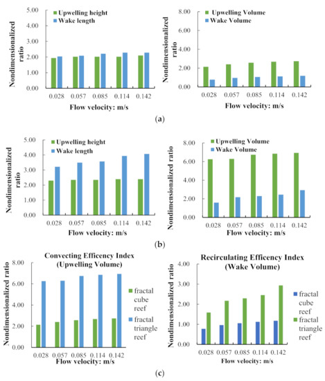 Our numerical simulations of the flow field patterns inside or around the AR models can explain the significant differences between the fractal ARs and traditional ARs through nondimensionalized ratio values, e.g., convection efficiency indices (,) and recirculating efficiency indices (, ). A comparison of the fluid effect or convection efficiency indices (e.g., upwelling height and upwelling volume ), recirculating efficiency (e.g., wake length and wake volume ) of fractal and traditional AR models, and the flow field efficiency indices showed that the fractal reefs with higher VSCI values have better performance in the upwelling and wake regions. From Figure 11c, it can be seen that the size of the upwelling region and the wake region around the fractal triangle AR model was greater than those of the fractal cube AR model. Therefore, a more detailed understanding of the relationship (e.g., the void space complexity, the influence range of the non-dimensionalized velocity, and the flow efficiency indices) will enable us to improve the design of complex reef structures to provide more suitable sheltering places to enhance fish recruitment, aggregation, and diversity.