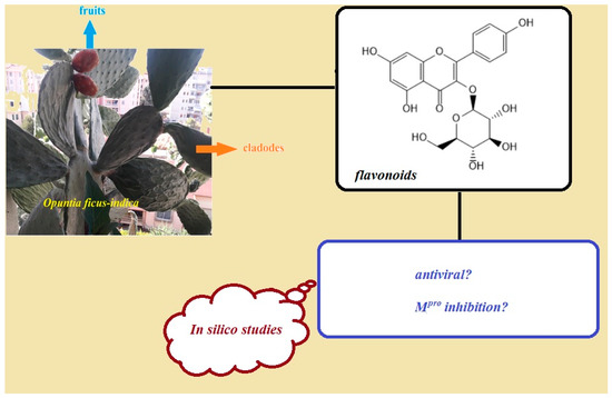 In this context, considering the previously ascertained utility of Opuntia ficus-indica plant extracts or isolated compounds as antiviral and anti-pneumonia agents, the potential of some of the same identified molecules was tested in the present in silico study as inhibitors of Mpro (Figure 1). In fact, the main protease of SARS-CoV-2 represents one of the most attractive targets for COVID-19 drug development due to the absence of this type of proteins in humans and its essential role in viral replication [39].