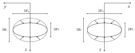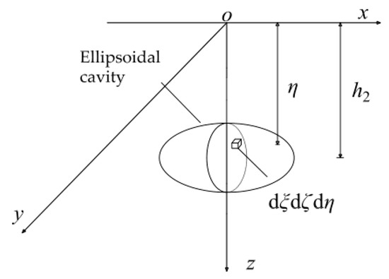 - Second, in actual engineering, cavities have their own stability due to their long-term existence and deformation development. Tian [21] proposed the concept of “cavity shell” and believed that cavities can maintain their stability under normal conditions but lose their stability and deform when they are disturbed by the outside world. Although the reason for the formation of cavities is complex, and their shape is irregular, for a cavity with stable surrounding rock, its shape should satisfy the reasonable distribution of the surrounding rock force. Moreover, because the surrounding stress is slightly concentrated, the stability of the circular hole-shaped cavities is higher than that of other linear cavities with angles. Therefore, in the related literature, cavities have mostly been simplified into spherical or ellipsoidal ones. Thus, this paper chiefly discusses the deformation mode of an ellipsoidal cavity and the soil settlement caused by it.