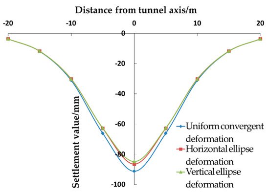 - First, this work believes that the impact of tunnel excavation on the cavity chiefly includes the overall movement and the convergence of the boundary. In order to effectively estimate the surface settlement and the displacement of the upper soil caused by the cavity, three symmetrical modes of shape convergence are proposed: the uniform convergence, the horizontal elliptical convergence, and the vertical elliptical convergence.